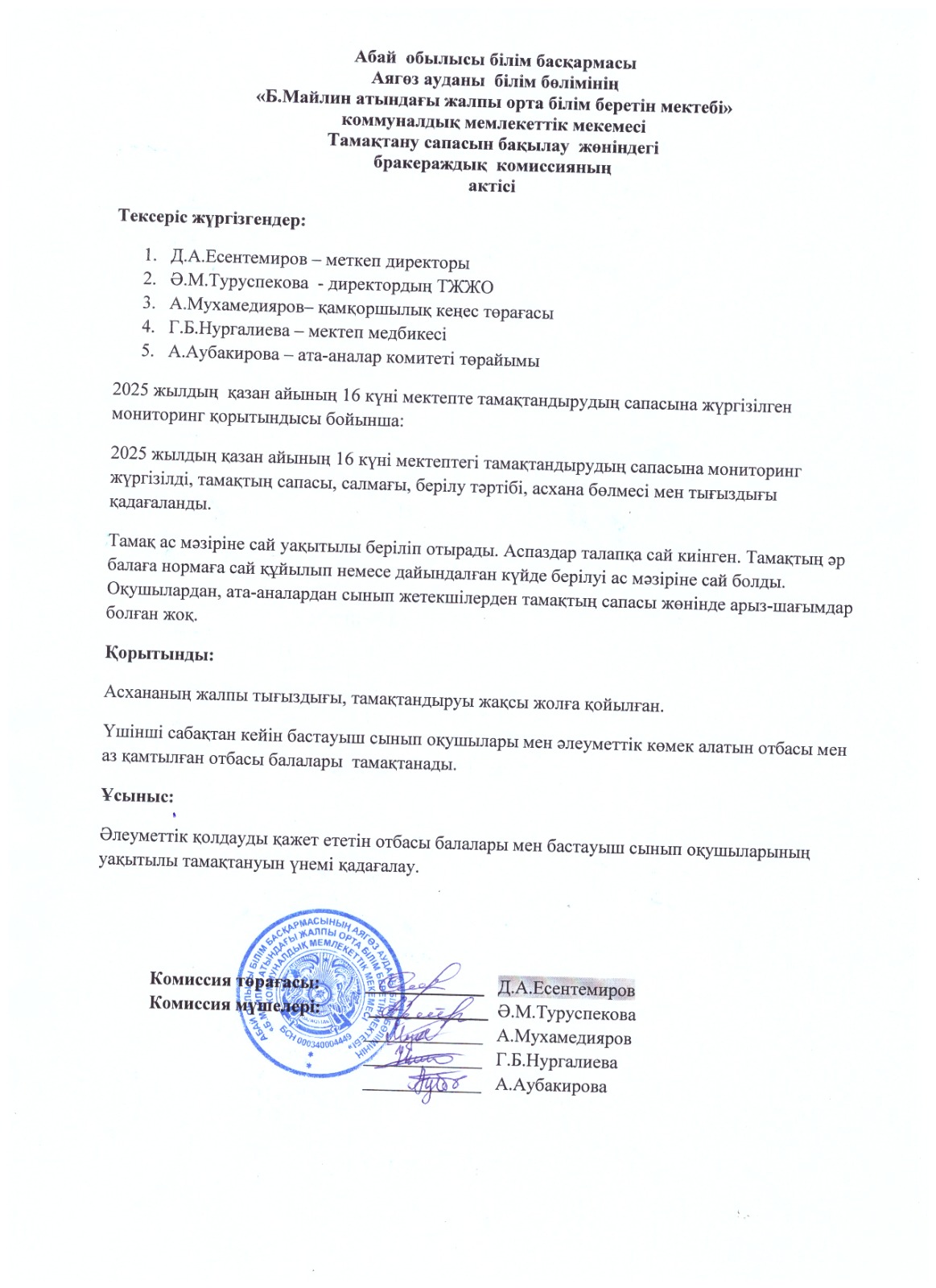 Тамақтану сапасын бақылау жөніндегі бракераждық комиссияның актсі