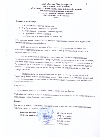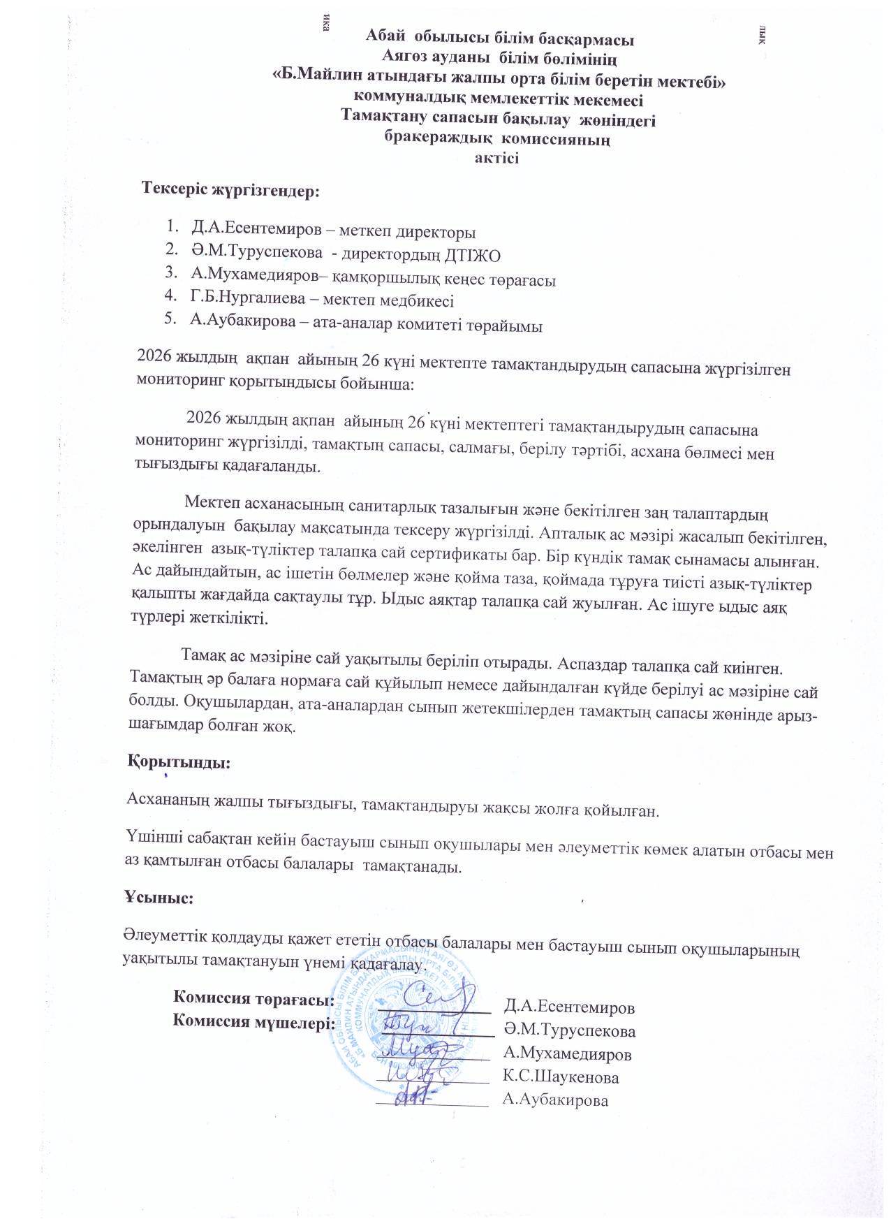 » Тамақтану сапасын бақылау жөніндегі бракераждық комиссияның актісі