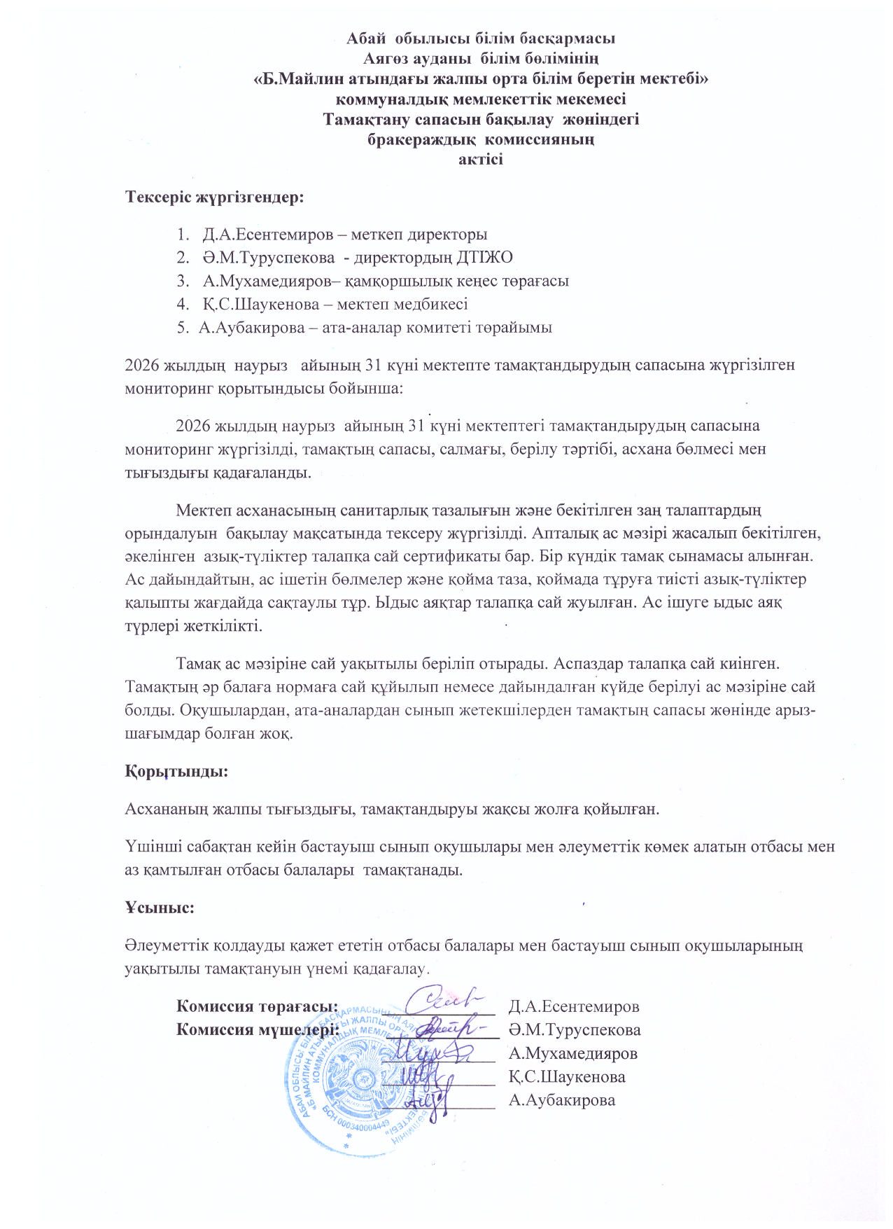 » Тамақтану сапасын бақылау жөніндегі бракераждық комиссияның актісі
